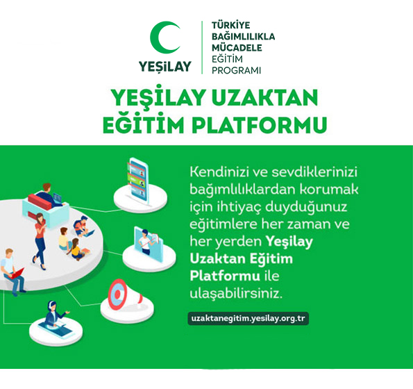 Yeşilay Uzaktan Eğitim Platformu’nda öğretmenler, öğrenciler, bağımlılık profesyonelleri ve bağımlılıklarla ilgili bilgi almak isteyen herkes için hazırlanmış alkol, madde, tütün, teknoloji, kumar bağımlılığı ve sağlıklı yaşam alanlarında etkinlikler, videolar ve interaktif içerikler bulunmaktadır.