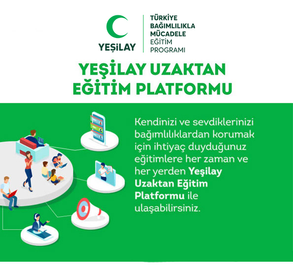 Yeşilay Uzaktan Eğitim Platformu’nda öğretmenler, öğrenciler, bağımlılık profesyonelleri ve bağımlılıklarla ilgili bilgi almak isteyen herkes için hazırlanmış alkol, madde, tütün, teknoloji, kumar bağımlılığı ve sağlıklı yaşam alanlarında etkinlikler, videolar ve interaktif içerikler bulunmaktadır.