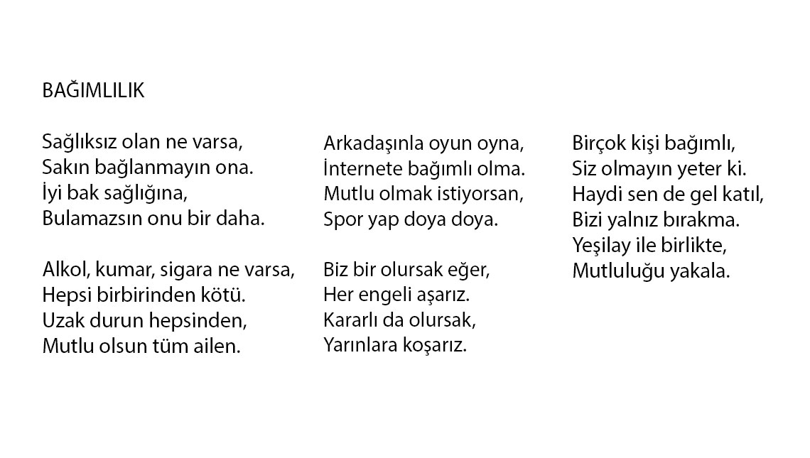 “Millî Eğitim Bakanlığımız ve Yeşilay için çocuklarımız ve gençlerimiz çok büyük öneme sahip, onlara her zaman sahip çıkmalıyız. Bakanlık olarak bize emanet edilen yavrularımızı en güzel şekilde yetiştirmeye önem veriyoruz. Matematik, fizik öğrenmeleri kadar kötü alışkanlıklardan uzak kalmalarını da önemsiyoruz. Her türlü bağımlılıktan azade gençliğin yetişmesi için gecemizi gündüzümüze katarak çalışmamız gerekiyor. Özel Eğitim ve Rehberlik Hizmetleri Genel Müdürlüğü olarak 18 milyon öğrencimize yönelik tüm çalışmalarımızda bu endişe ve hassasiyetle hareket ediyoruz. Önleyici hizmetler kapsamında çalışıyor, gençlerimizi çocuklarımızı bağımlılığa götürecek her türlü olumsuzluklardan korumayı hedefliyoruz. Çünkü en önemli noktanın bu zorluklarla tanışmadan önce gençlerde bilinç oluşturmak olduğunu düşünüyoruz. Biz tüm eğitimci arkadaşlarla bu çaba içindeyiz. Gençlerimiz bilgi üreten, okuyan, yazan, çizen, girişimci, empati yapan gençler olsun; var olan yetenekler en güzel şekilde geleceğe taşınsın; hem ulusal hem uluslararası arenada kendi varlığını en güzel şekilde ortaya koysun istiyoruz. MEB olarak Yeşilay’la yaptığımız iş birliklerinin de bu hedefe katkı sağlama noktasında önemli olduğuna inanıyoruz.”