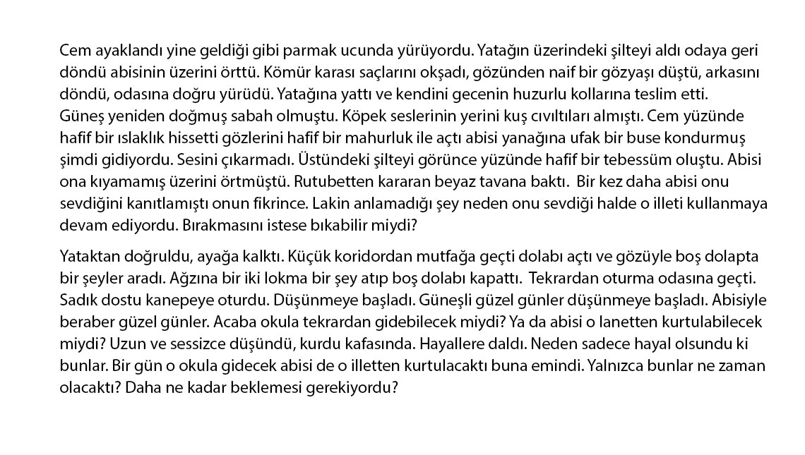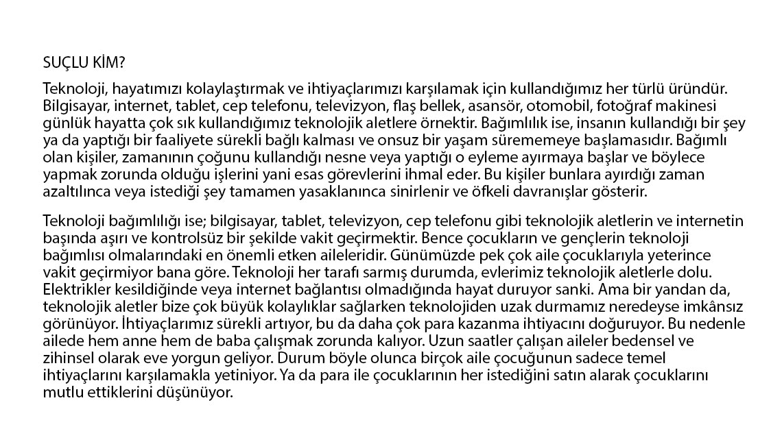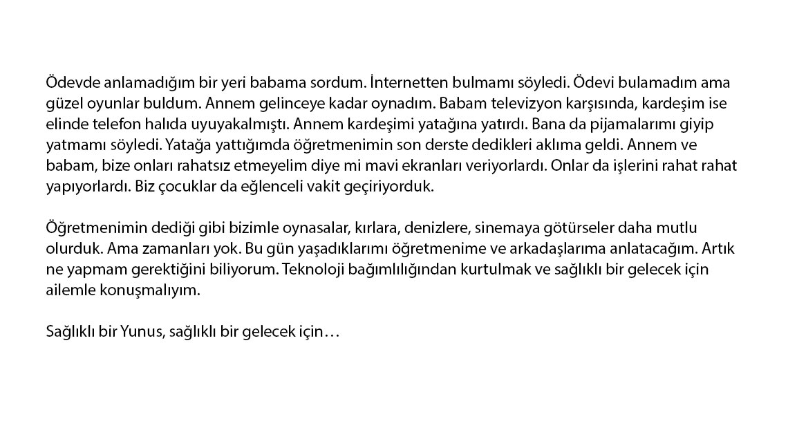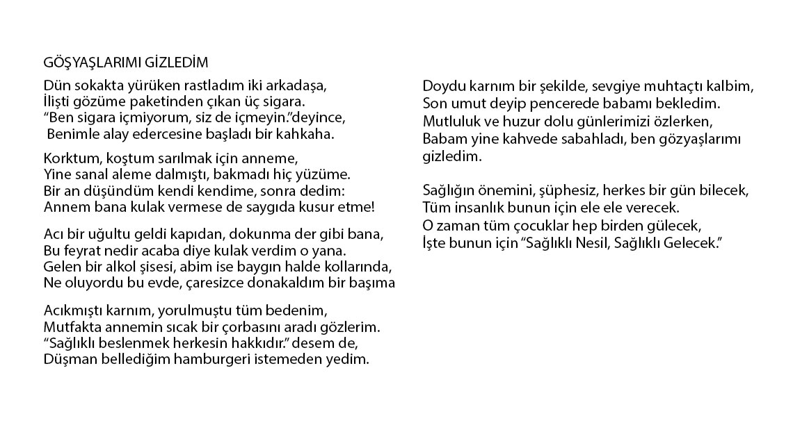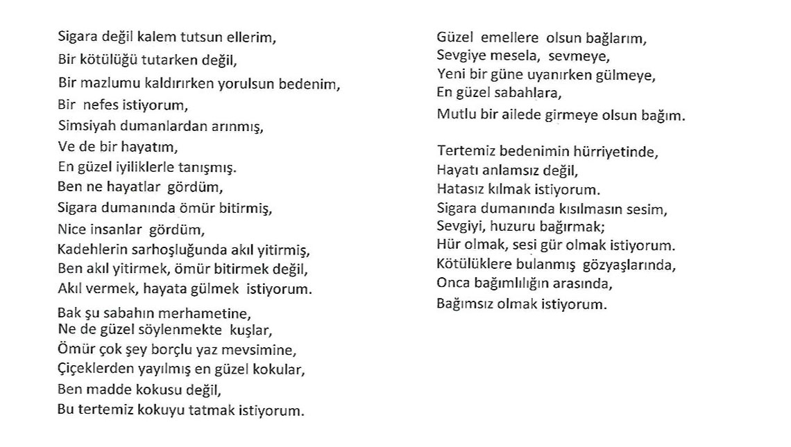 İlkokul, ortaokul ve lise öğrencilerinin katılımına açık yarışmada, edebi ve görsel olmak üzere iki kategoride bağımlılık konulu eserler değerlendirildi. Yarışmanın ilk aşamasında bu iki kategoriden 81 ilin ilkokul, ortaokul ve lise birincileri belirlendi ve ödüllendirildi. Toplam 480 il birincisinin değerlendirildiği Türkiye finalinde ise her düzey ve kategoriden ülke şampiyonları belirlendi. Ödül töreninde dereceye giren 18 eser sahibine ödülleri takdim edildi. Kategori birincileri 5 bin TL, ikincileri 3 bin 500 TL, üçüncüleri 1.000 TL ödülün sahibi oldu.