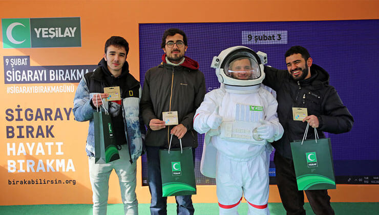 Yeşilay, 9 Şubat Dünya Sigarayı Bırakma Günü’nde tüm bireyleri tütün kullanımının zararları konusunda bilinçlendirmek amacıyla çeşitli etkinlikler gerçekleştirdi. Üsküdar Meydanı’nda düzenlediği bilgi yarışması ile tütün kullanımının zararlarına ilişkin pek çok bilinmeyeni gün boyu 7’den 70’e katılımcılarla paylaşan Yeşilay’ın geçen yıl yarı açık alanlarda ortaya çıkan astronotu bu yıl da meydanda sigarayı bırakma çağrısı yaptı.